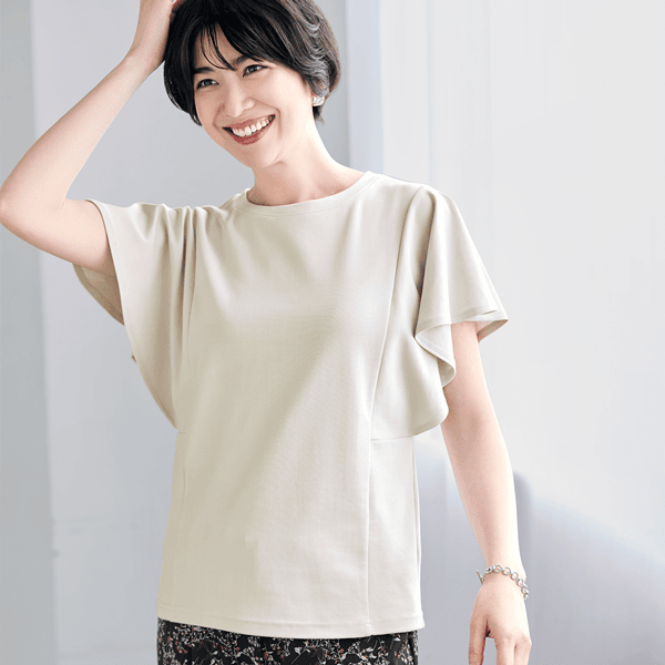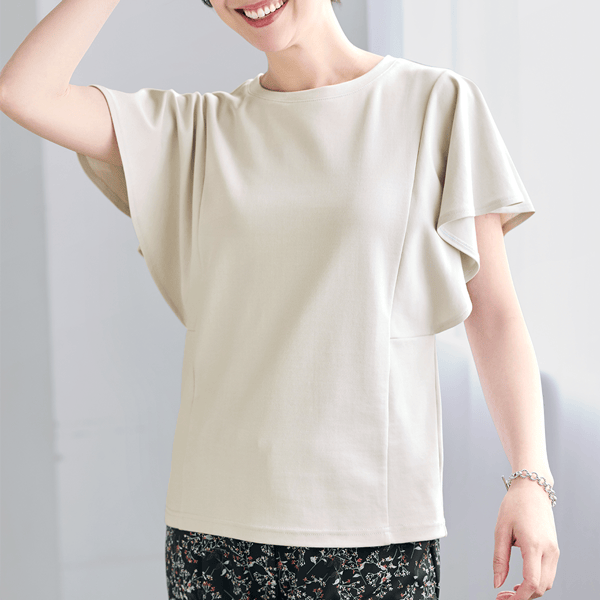 気兼ねなく薄い色が楽しめるカットソーです。近くで見ても透け感が気にならないことに驚きました。フレアスリーブが女性らしい上品なシルエットを作り出してくれます。袖は脇マチ付きなので安心して着られます。