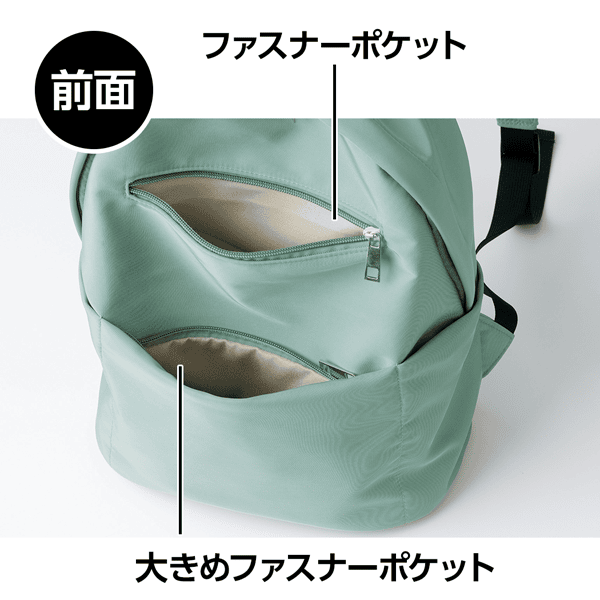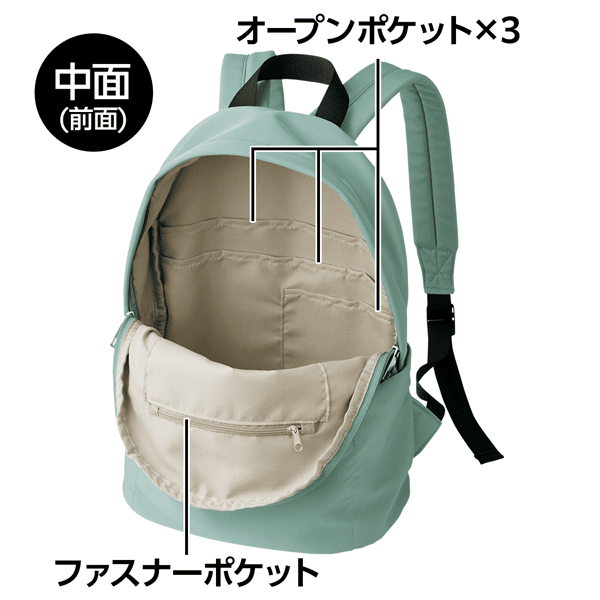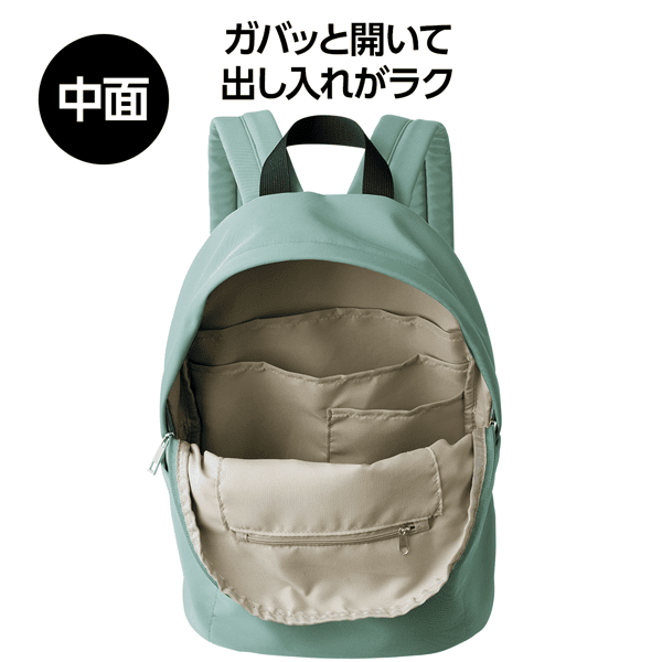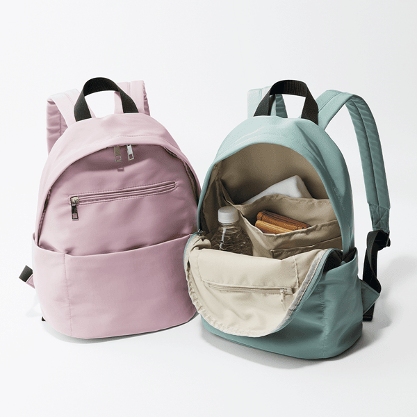 8つのポケットで荷物の整理がしやすい、使い勝手抜群の軽量リュック。背中におさまって持ちやすいミディアムサイズで、ファスナー開閉で大きく開くので中身がひと目でわかります。