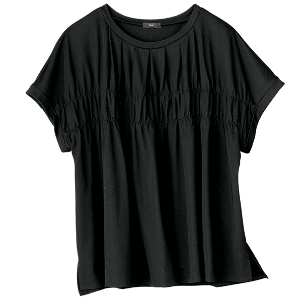 接触冷感機能付きでひんやりする、着心地ラクできれい見えするカットソー。たっぷりと入れたシャーリングが映え、ゆったりとしたシルエットながら着ぶくれしないサイズ感です。