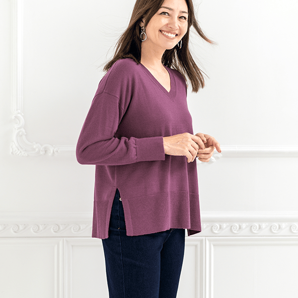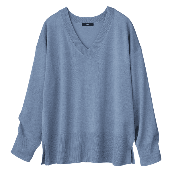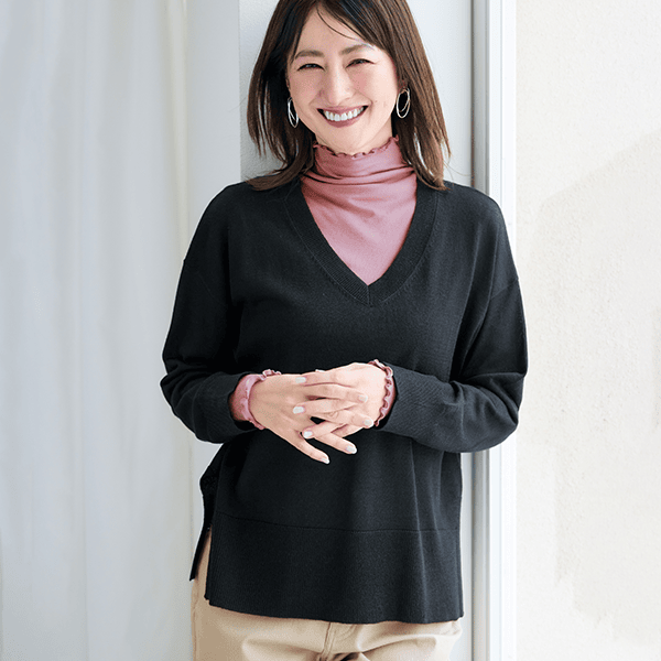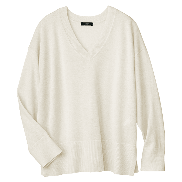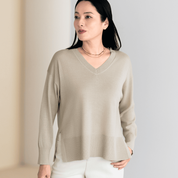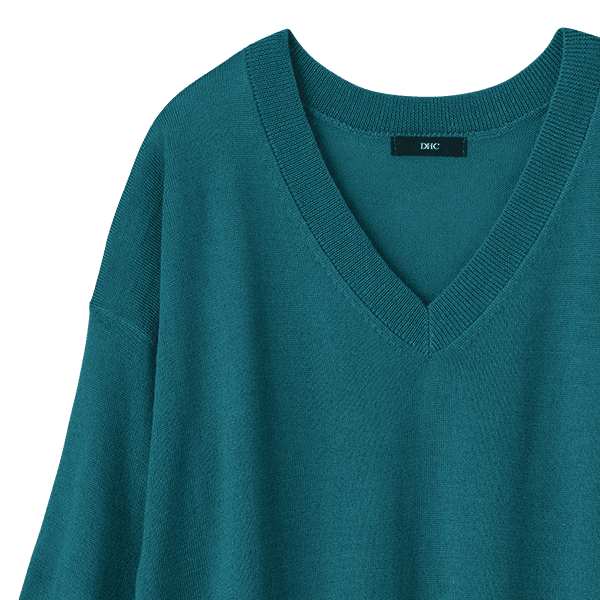 お手入れラク♪上質なイタリア糸を使用した首回りすっきりVネックニット
