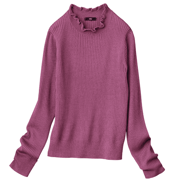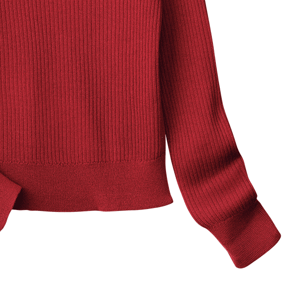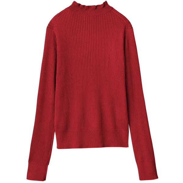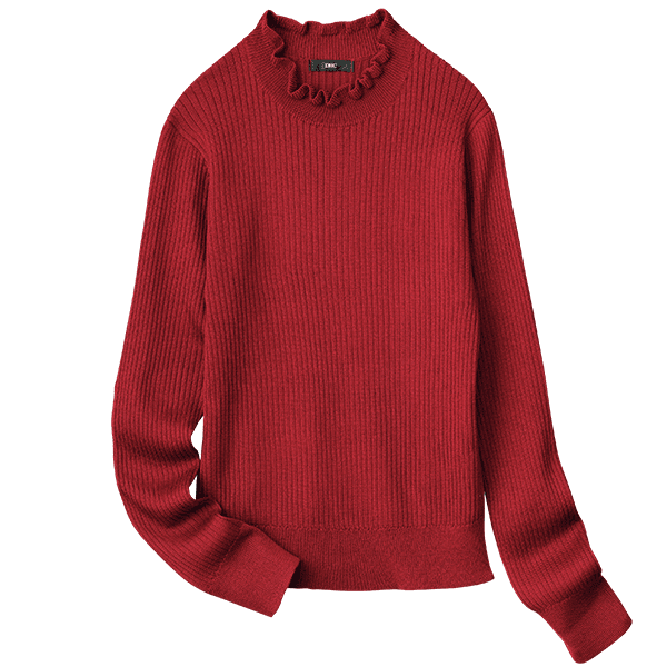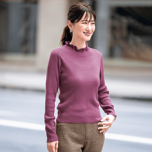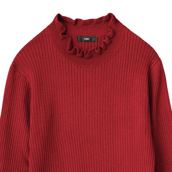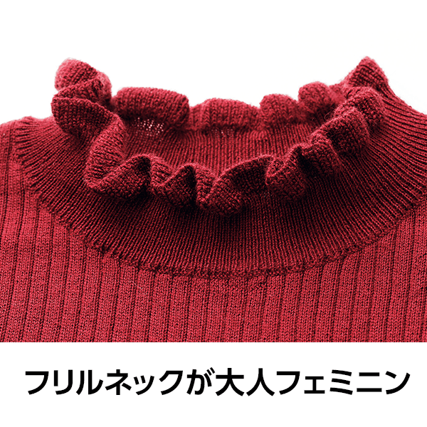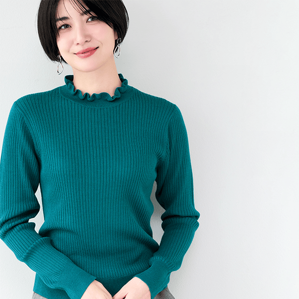 首元のフリルデザインが大人可愛いく、絶妙なリブ幅でフィットしすぎないのにほっそり見えるのが魅力。ヴァージンウールをブレンドしたやわらかな肌ざわりで着心地も抜群です。イタリア糸ならではの美しく鮮やかな発色が、フリルとともに顔まわりを彩ります。