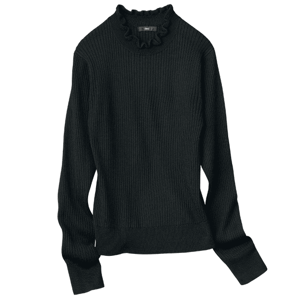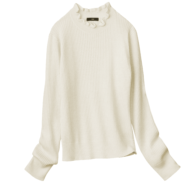 首元のフリルが品良く立ち上がっているデザインです。かわいらしすぎず、大人にぴったりのフェミニンさがリブ編みの身頃との相性ばっちりです。袖はかなりゆとりがあるので長袖インナーを着込んでも問題なさそうです。