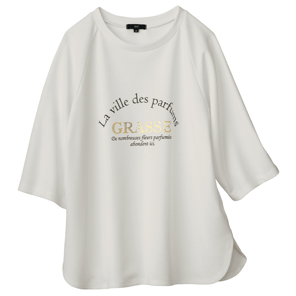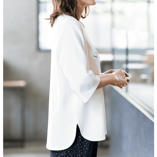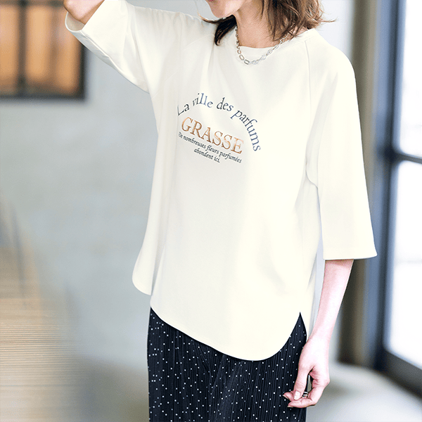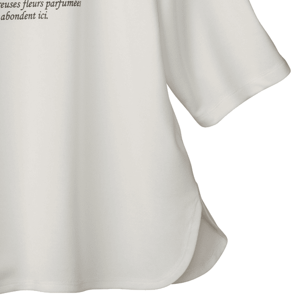 少し厚手のTシャツ生地で、オフホワイトでも透け感は気になりません。麻特有のチクチク感はなく、ゆとりもあり、着やすいです。英字(仏字)Tシャツに抵抗が出てくる年ごろですが、主張しすぎないので、試しにどうぞ。二の腕も隠れる袖丈で安心です。