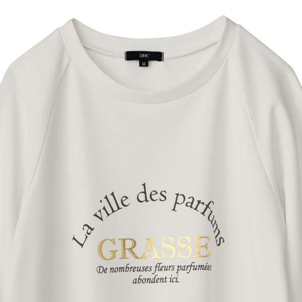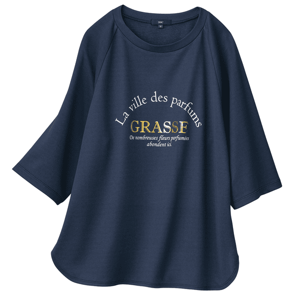 ゴールドのプリントが華やかなカットソーです。麻混ですが綿が入っているので、少しふくらみを感じる柔らかい素材感です。Sサイズが良いです。少し長めの袖丈が日除けになり、折り上げて半袖にして着ても抜け感が出て素敵です。