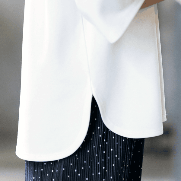 長めの袖丈がリラックス感があり、冷房対策にもなるのでうれしいです。少し長いと感じたら、袖口を折って着てもすてきだと思います。生地はやわらかく少しシャリ感があり、心地よい肌触りです。