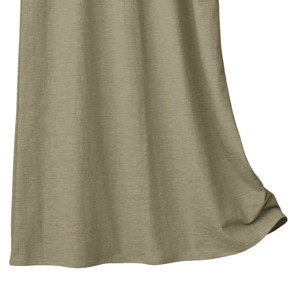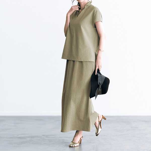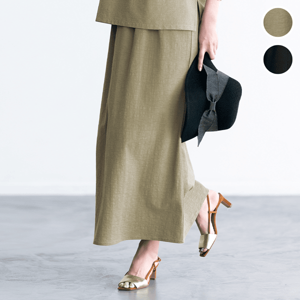 麻ならではの吸放湿性の高さと肌ばなれのよさを持つヘンプは、近年注目のエコ素材。リネンよりなめらかで着心地がよく、セットアップで着るとよりシックに高見えします。シンプルですっきりとしたシルエットのロングスカートで縦ラインを強調し、スタイルアップして見えます。