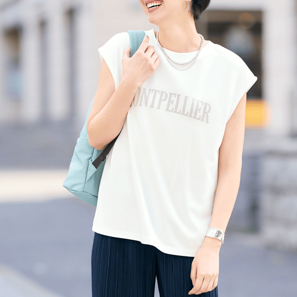 ムレずに爽やか、ひんやりドライタッチで涼しいヘンプ混のカットソー。ロゴが目立ちすぎないのでロゴT初心者でも着やすい1枚。女性らしいスリーブレスデザインはボトムス次第でカジュアルにもキレイめにも着られます。ほどよいサイズ感で羽織りの下に重ねてももたつきません。