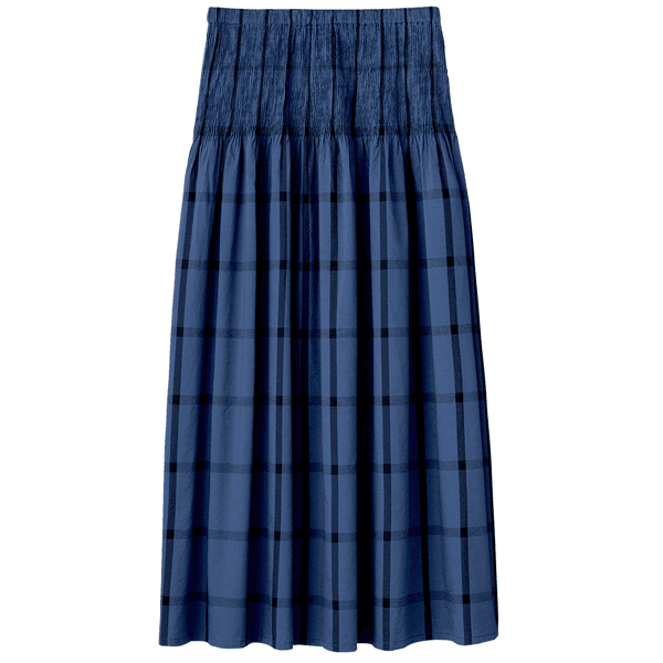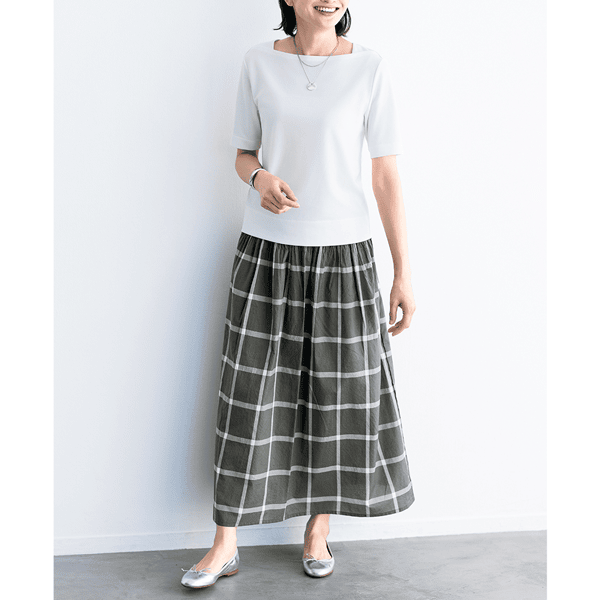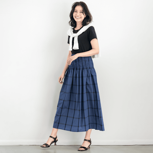 サラッとした肌触りで夏にぴったりのスカートです。細やかなシャーリングが腰周りをすっきり見せてくれるので、トップスをインして着ても自然とコーデが決まります。