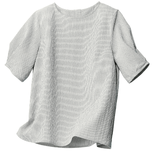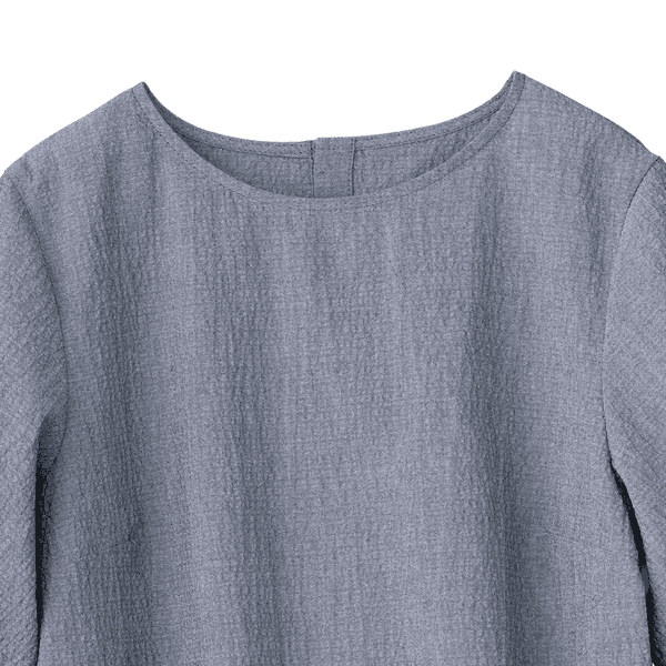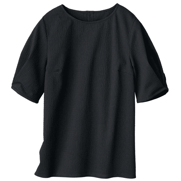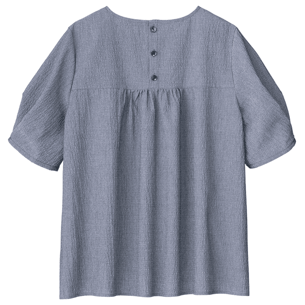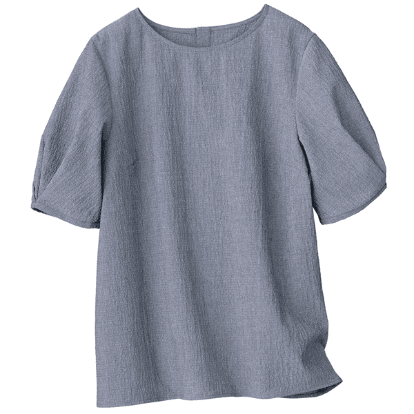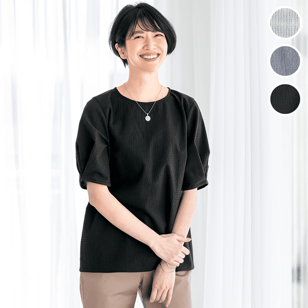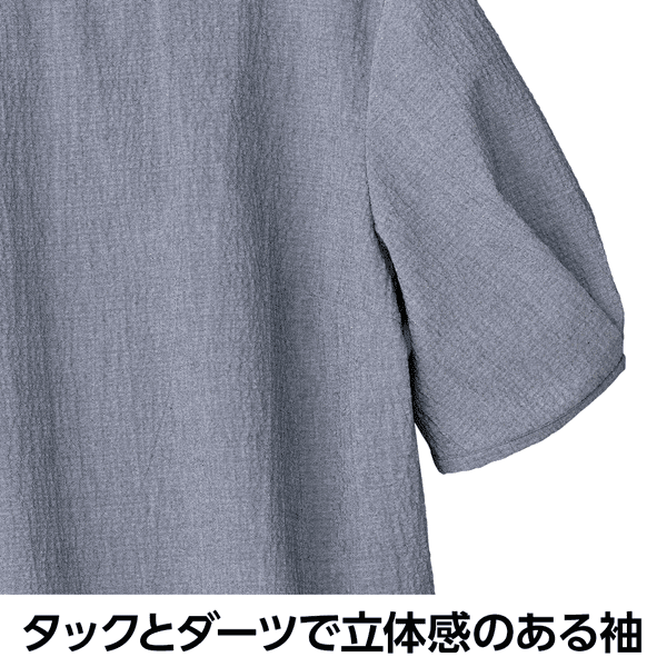 凹凸のある生地感で肌ばなれがよく、さわやかで心地よいドライタッチなブラウス。Aラインシルエットとハリのある素材がボディラインをひろわず、すっきり見えがかないます。