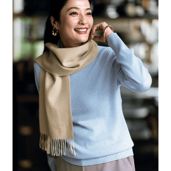 カシミヤの上品な光沢となめらかさにシルクを混ぜ、いっそう上質に。とろけるような肌ざわりの贅沢な風合いに仕上げました。顔まわりがすっきり見える詰まり過ぎない衿の高さで、ウエストラインを絞らずほどよくゆとりを入れた、身体のラインをひろいにくい設計です。