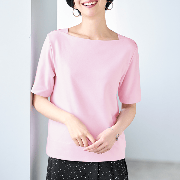 すっきりとしたボートネックと5分袖がきちんと上品見え