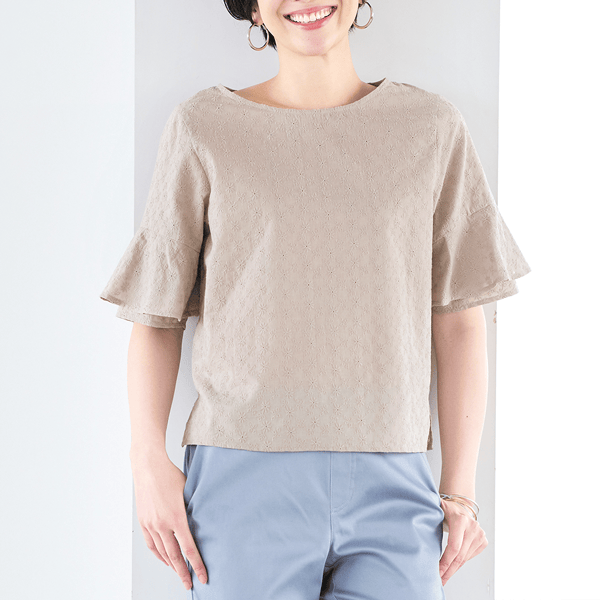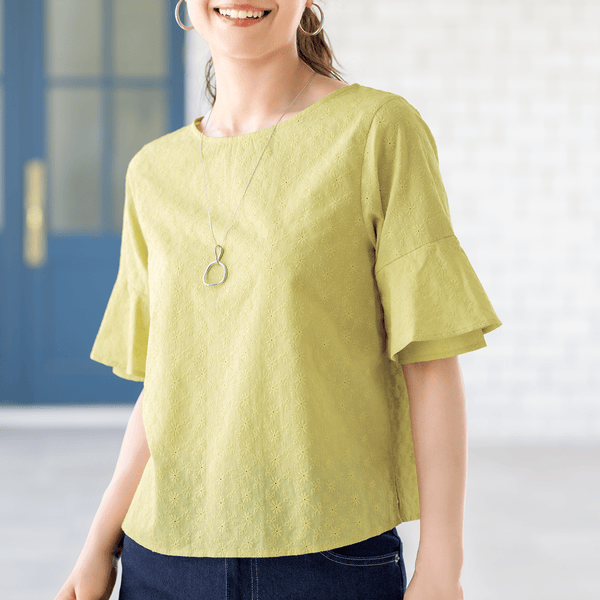 コットン素材のエンブロイダリーレースが軽やかなブラウス。ストンとしたシルエットとラッフルスリーブが風を通して涼しげ。身丈は長すぎないのでウエストアウトでもバランスをとりやすく、ボトムスを選びません。
