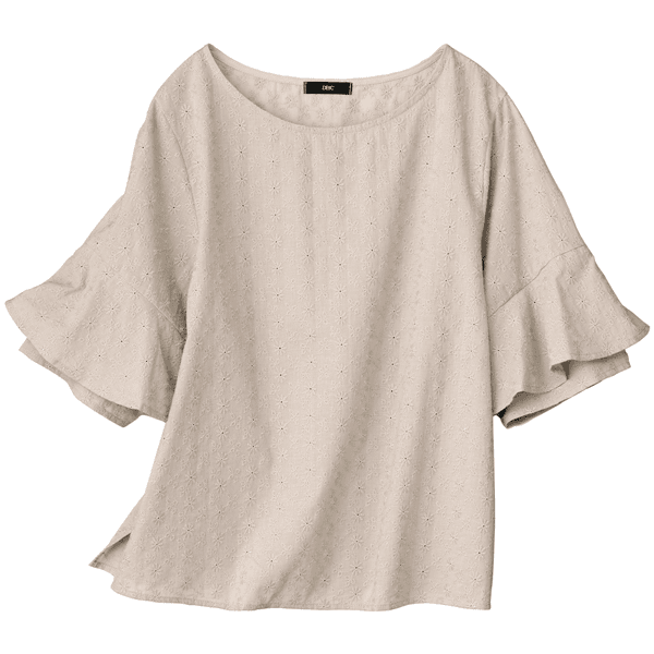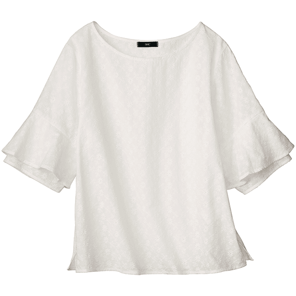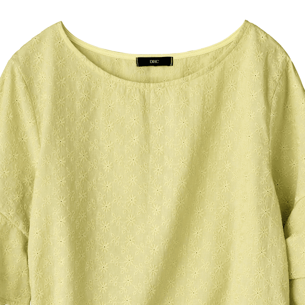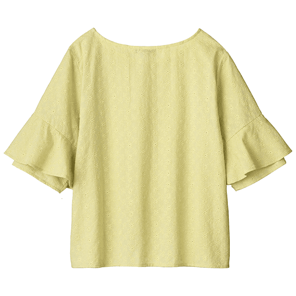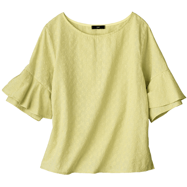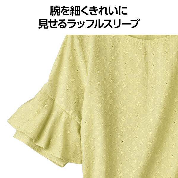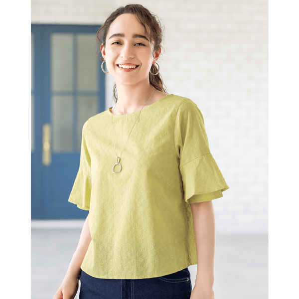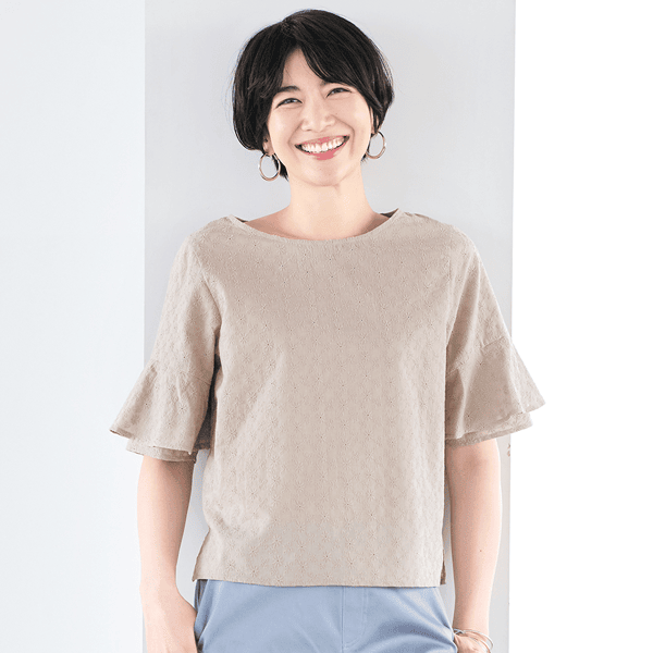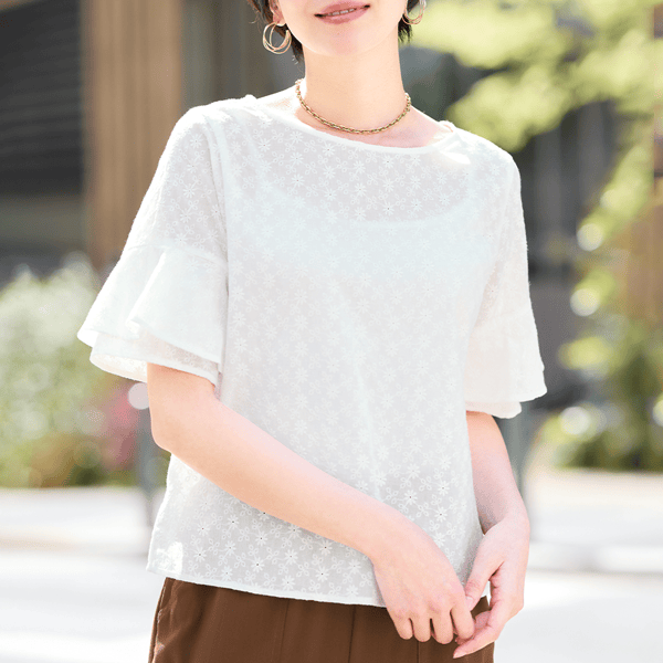 コットン素材のエンブロイダリーレースが軽やかなブラウス。ストンとしたシルエットとラッフルスリーブが風を通して涼しげ。身丈は長すぎないのでウエストアウトでもバランスをとりやすく、ボトムスを選びません。