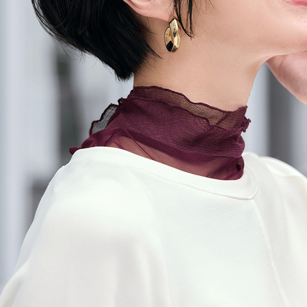 首元を自然に隠す、オールシーズン使えるネックカバー。シルク100%の衿元は薄手でゴワつかず、すっきりエレガントに首を隠せます。透け感のあるメッシュなので暑い日もさっとかぶるだけで着けやすいです。軽くて小さくたたみやすいのも◎。ハンカチ感覚でさっと持ち運びできます。