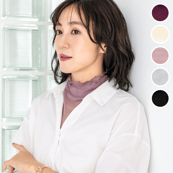 首元を自然に隠す、オールシーズン使えるネックカバー。シルク100%の衿元は薄手でゴワつかず、すっきりエレガントに首を隠せます。透け感のあるメッシュなので暑い日もさっとかぶるだけで着けやすいです。軽くて小さくたたみやすいのも◎。ハンカチ感覚でさっと持ち運びできます。