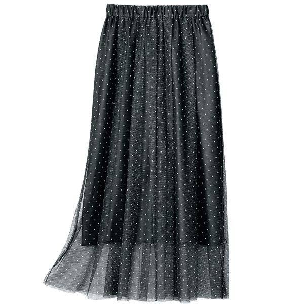 ハリのある光沢裏と、落ち感ある星形編目のチュールがコンビになった、エレガント見えするスカートです。丈が長いので、チュールだけ5cm位カットしたらSサイズでバッチリです!ウエストはゴムでスカートはゆとりがあるので窮屈ではありません。チュールの裾は裁切りなのでお直しやすいかな、と思います。その際は脇の縫い目を少し補強していただく事をお勧めします。