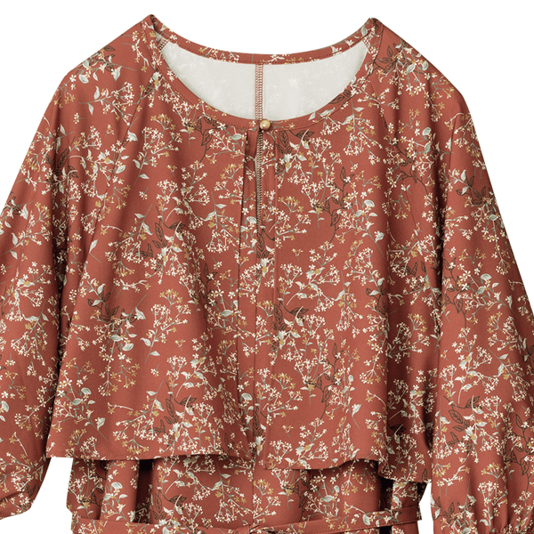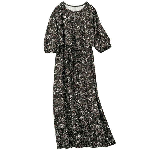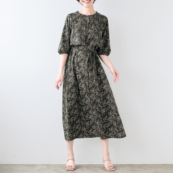 さらりと涼やかな生地ながらシックな色柄で秋を先取り!オンオフで使えて長く楽しめるフレアシルエットのワンピース。ケープ風のデザインが重心を上げてスタイルアップして見え、ウエストの細見えもかないます。