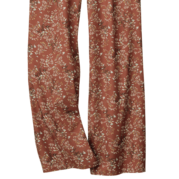 華やかな花柄とワイドシルエットで脚のラインを真っすぐに