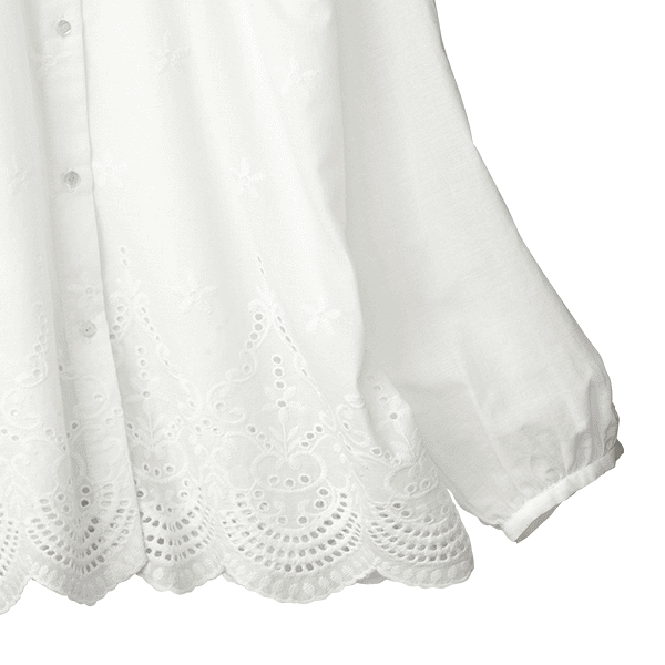 さらりとした綿混素材で今の時期から秋口まで活躍するお役立ちシャツです。ボタンを閉じて着てもゆとりがありますが、このままゆったり着たいので9号でぴったりです。袖周りも余裕がありつつ、袖口ギャザーでおさまりがよくフェミニンな雰囲気です。刺しゅうとスカラップの洗練されたデザインが上品です。