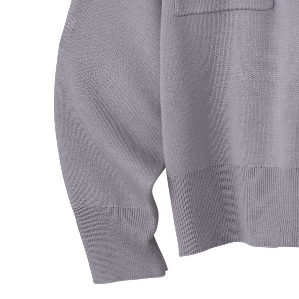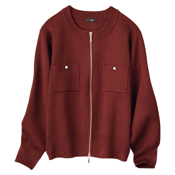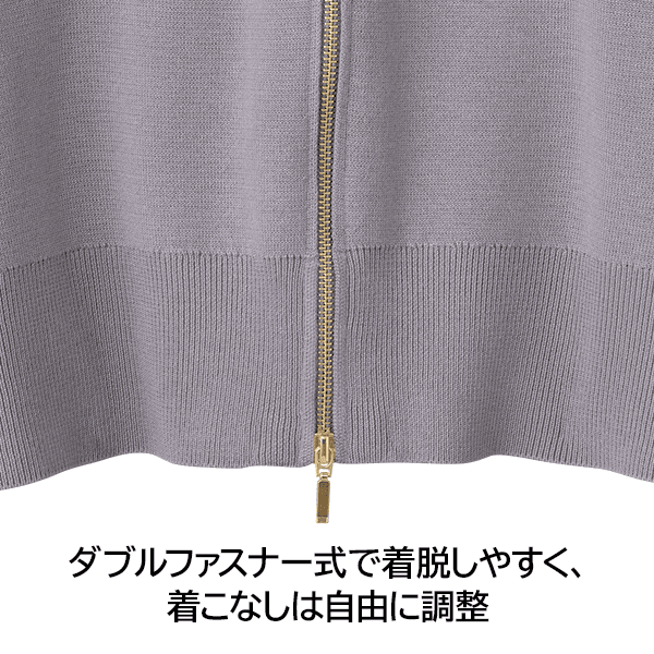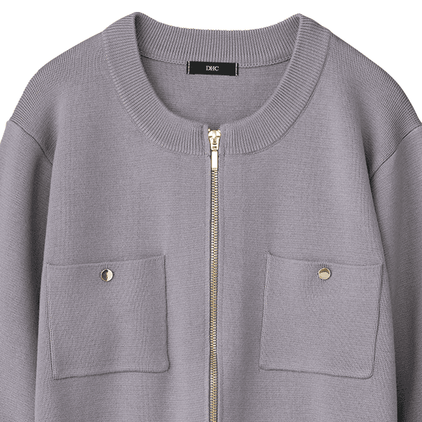 しっかり厚みのある素材感がきちんと感を演出してくれるニットジャケットです。袖周りもゆったりとしているのでもたつきづらく、中に着るトップスを選ばす合わせやすいです。ダブルファスナーで裾の開き具合も調節できるのがうれしいです。