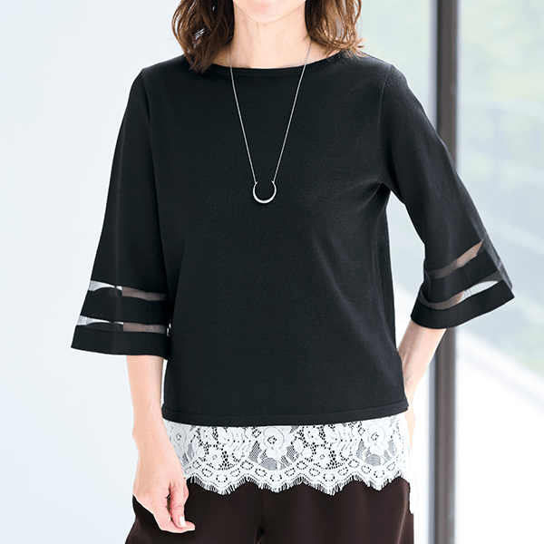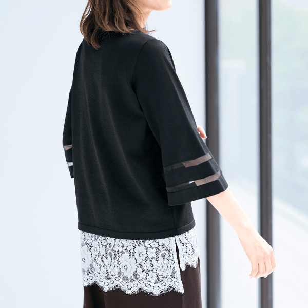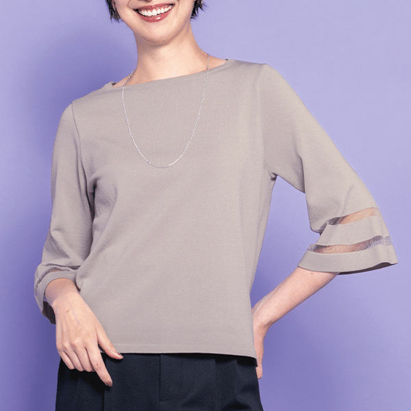 二の腕をカバーするフレアスリーブに、シアーボーダーがエレガントさをプラス