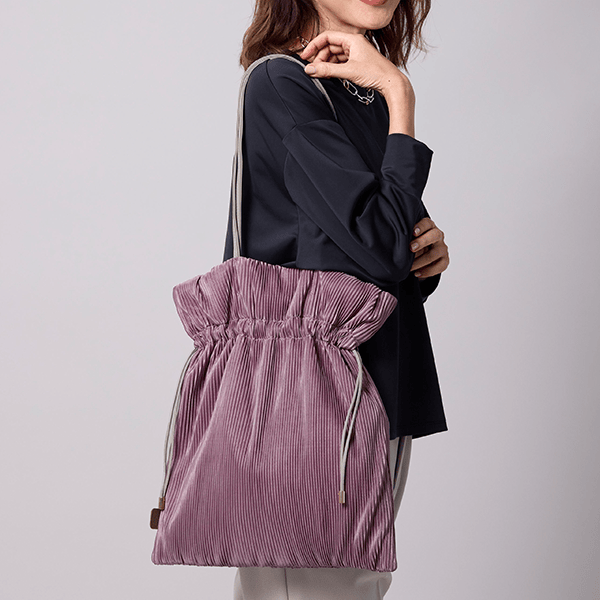 やや光沢感のあるプリーツを使用した上品なトートバッグ。ハンドルを長めに設定しているので、しっかりと肩から掛けられます。きゅっと絞ると巾着のシルエットになるので、その日の洋服や荷物の量に合わせてお好みのシルエットに変身できます!通勤や通学、セレモニーのサブバッグにも対応可能な、きれいめシンプルデザイン。