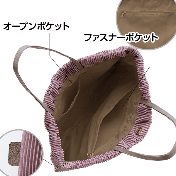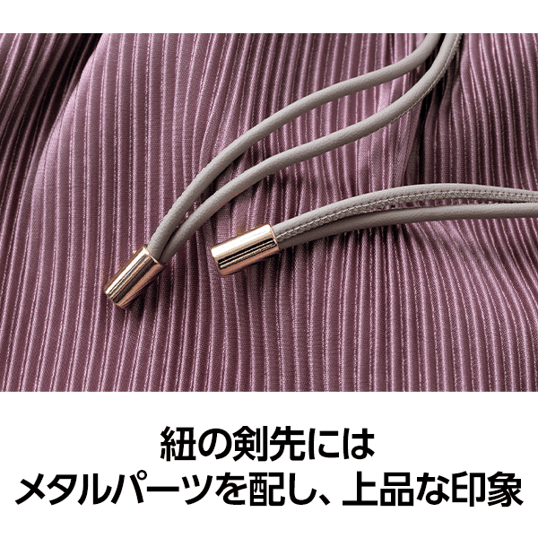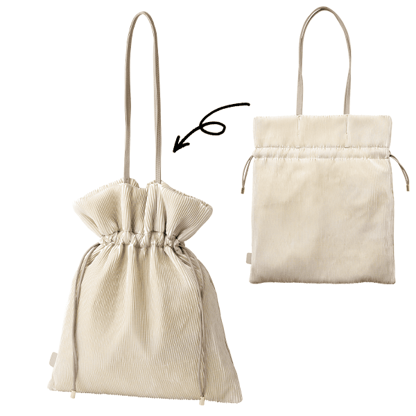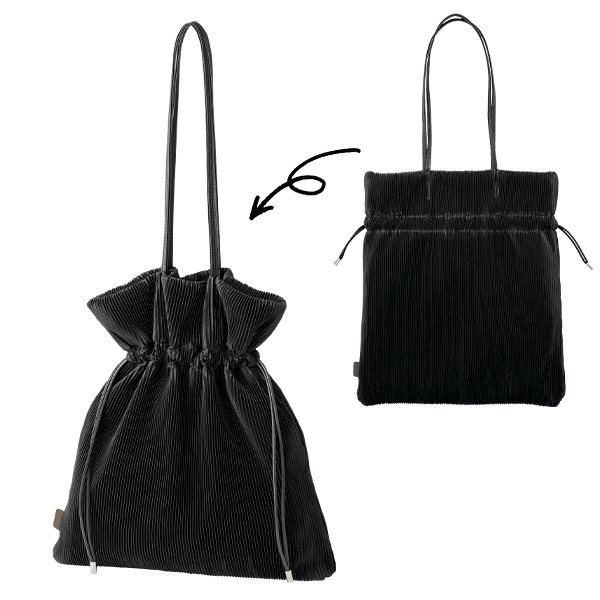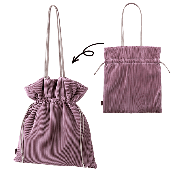 やや光沢感のあるプリーツを使用した上品なトートバッグ。ハンドルを長めに設定しているので、しっかりと肩から掛けられます。きゅっと絞ると巾着のシルエットになるので、その日の洋服や荷物の量に合わせてお好みのシルエットに変身できます!通勤や通学、セレモニーのサブバッグにも対応可能な、きれいめシンプルデザイン。