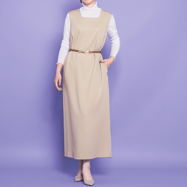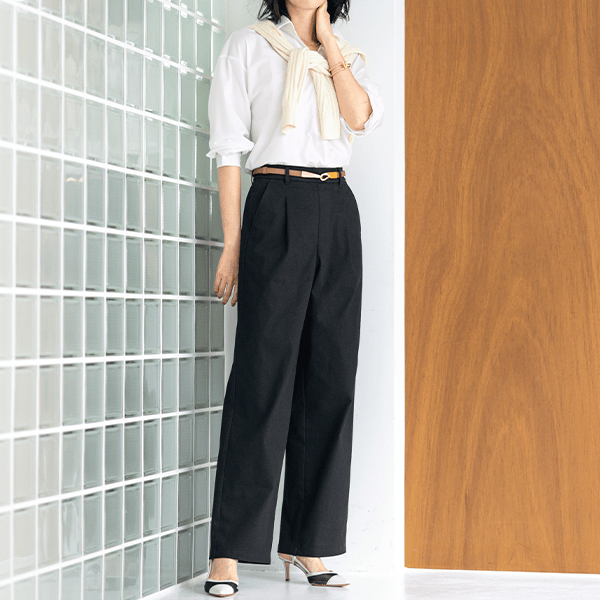後ろでスライドして長さが調節できるベルト。好きなウエスト位置で自由に合わせられます。バックルはクリップ式で着脱がかんたん。パンツ・チュニックやワンピースなど、様々なスタイルに合わせやすいのも魅力。
