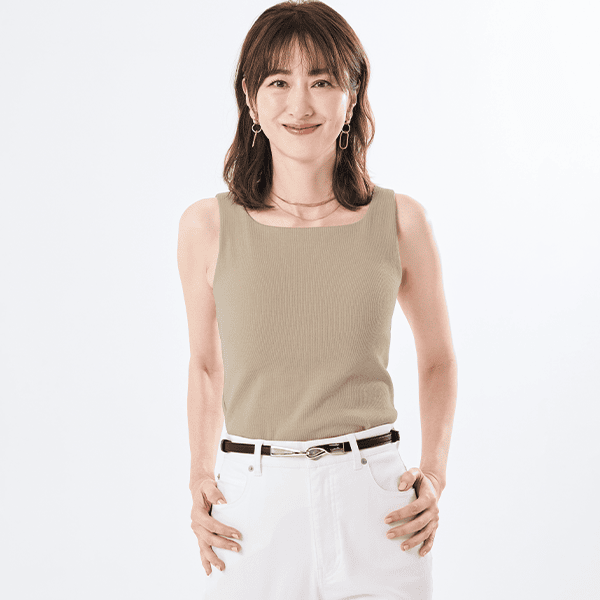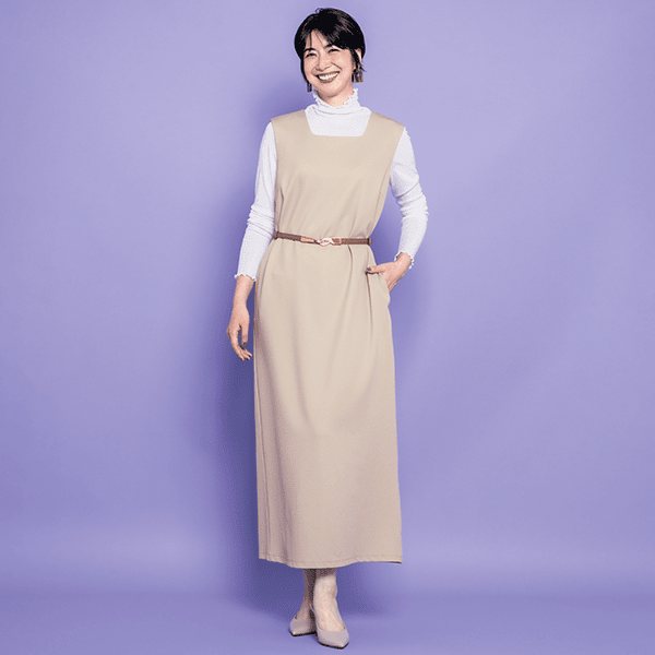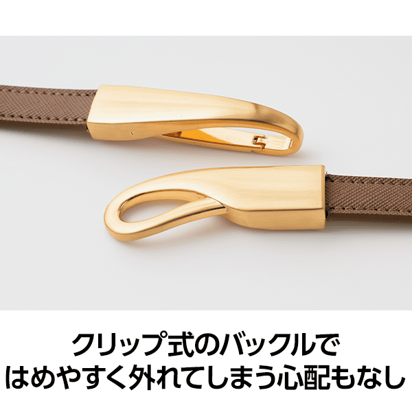 後ろでスライドして長さが調節できるベルト。好きなウエスト位置で自由に合わせられます。バックルはクリップ式で着脱がかんたん。パンツ・チュニックやワンピースなど、様々なスタイルに合わせやすいのも魅力。