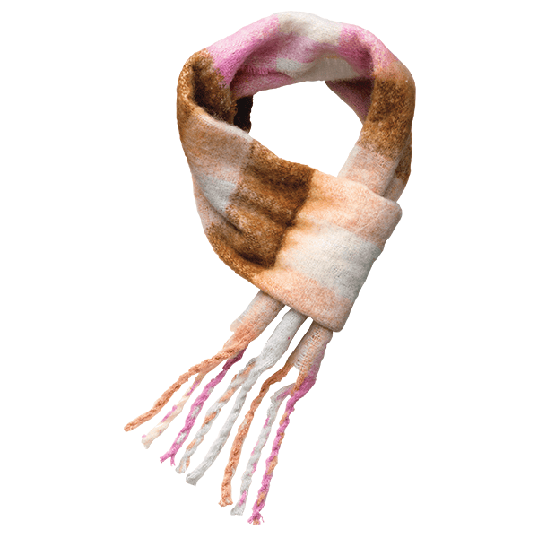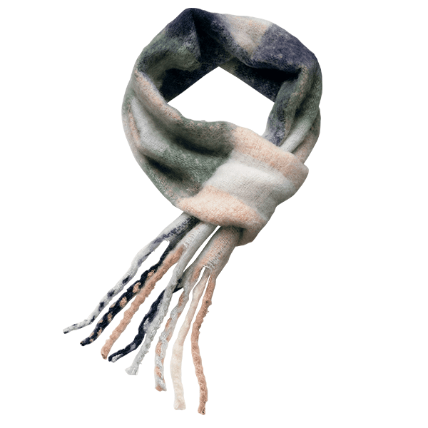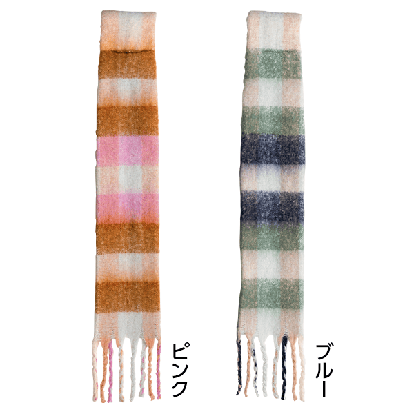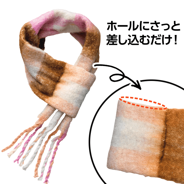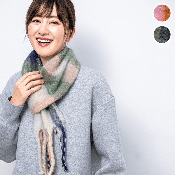 微起毛素材でふんわりあたたかく、軽い着け心地のショートマフラー。端のホールに通すだけでかんたん装着できます。コンパクトなサイズでアウターに合わせやすく、チェック柄の色合いはコーデのアクセントに。