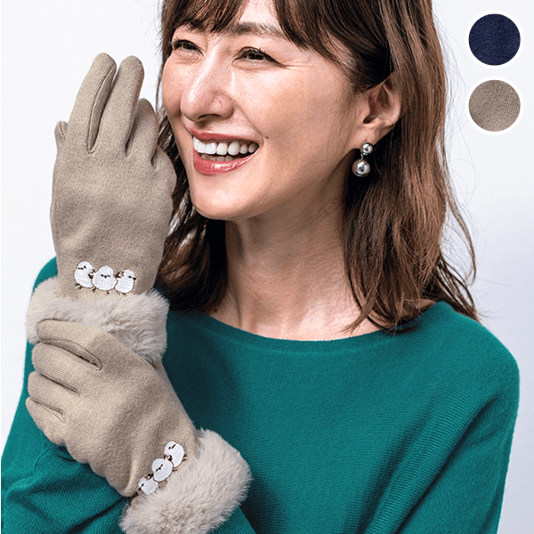 人気急上昇中のほっこり愛らしいシマエナガの刺しゅうがポイントの、ファー付き5本指手袋。甲側は裏ボアであったかい。冬のおしゃれのアクセントになる、可愛い動物柄の防寒小物です。
