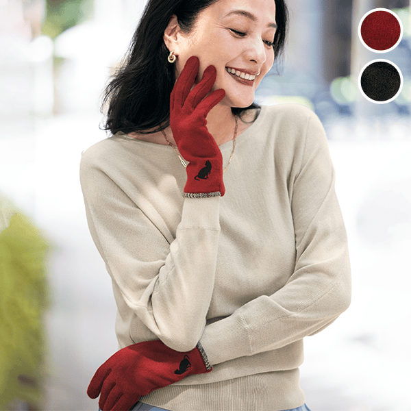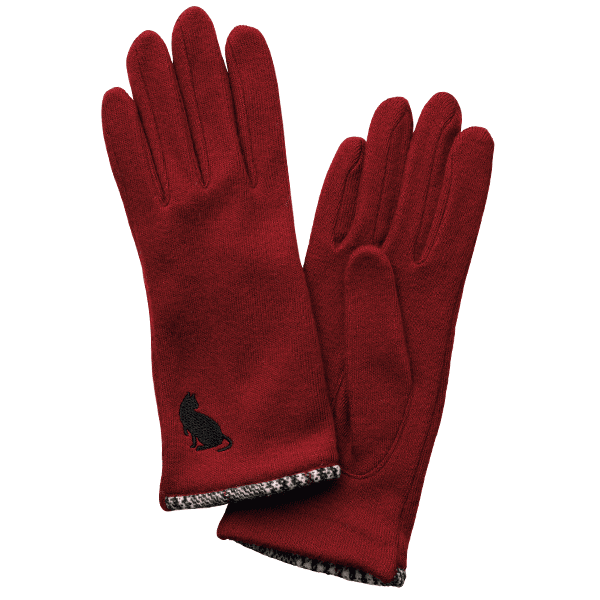 大人っぽいネコのシルエット柄刺しゅう×手首(甲側)のチェック柄がポイントのあたたか5本指手袋。甲側は裏ボアであったかい。冬のおしゃれのアクセントになる、可愛い動物柄の防寒小物です。