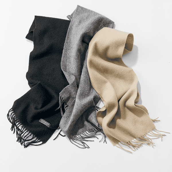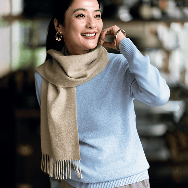 ほんのり光沢感のある上質なカシミヤだけを使用したマフラーは、やわらかくしっとりとした質感で心地よく巻けます。