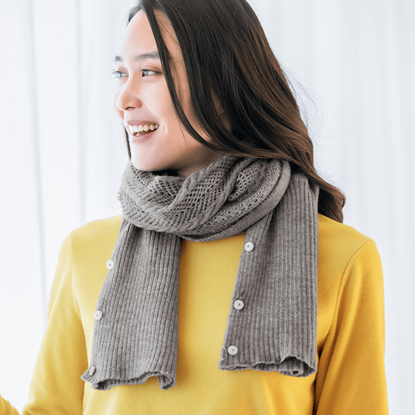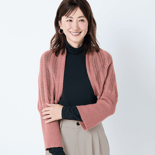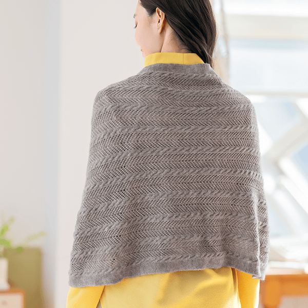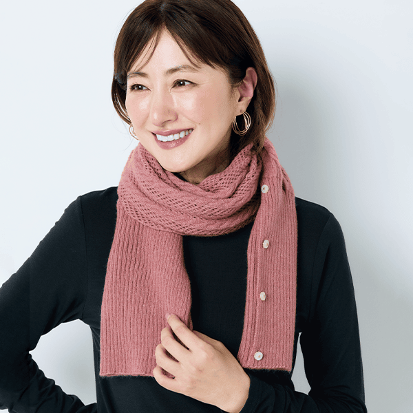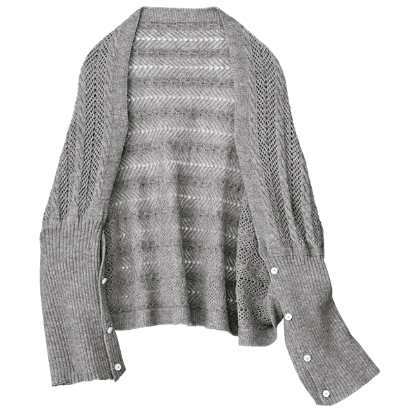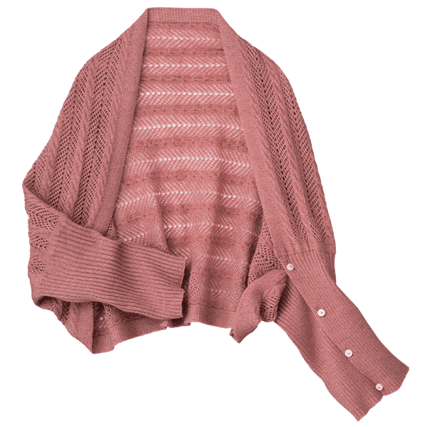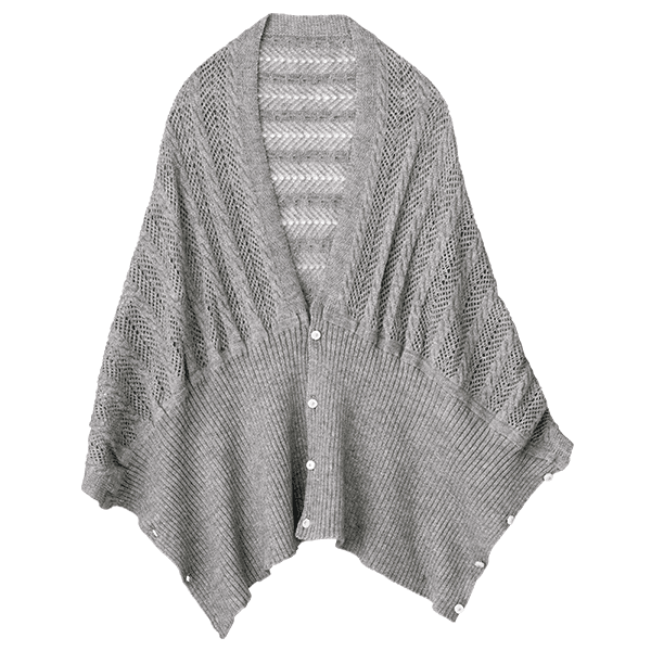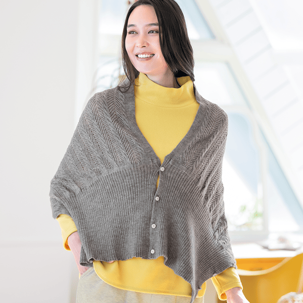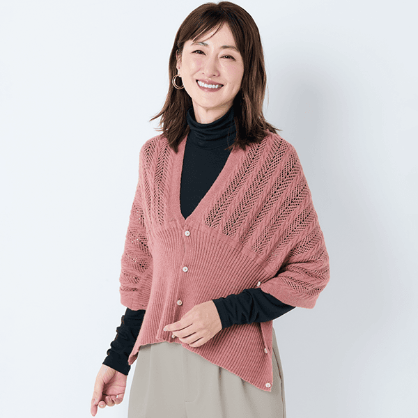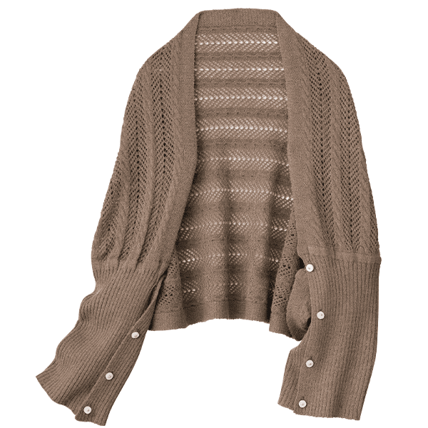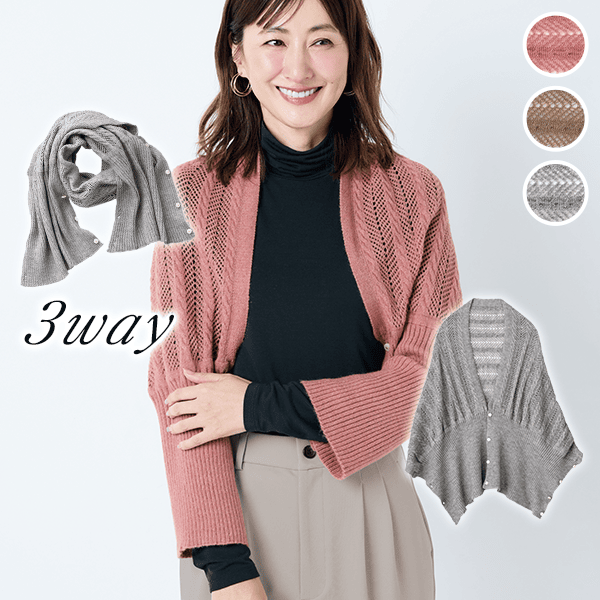 左右のボタンをそれぞれ留めて華やかなボレロ風に、前でボタンを留めて軽やかなカーディガン風に、2つ折りでストールにすれば首元の冷え対策にも。1枚三役で外出時のコーデのアクセントになって、おうちでも重宝する3WAYお役立ちニット。上品で軽やかな透かし編みは、重くならずデイリーに羽織れます。