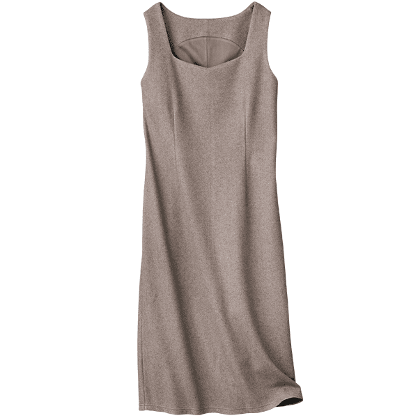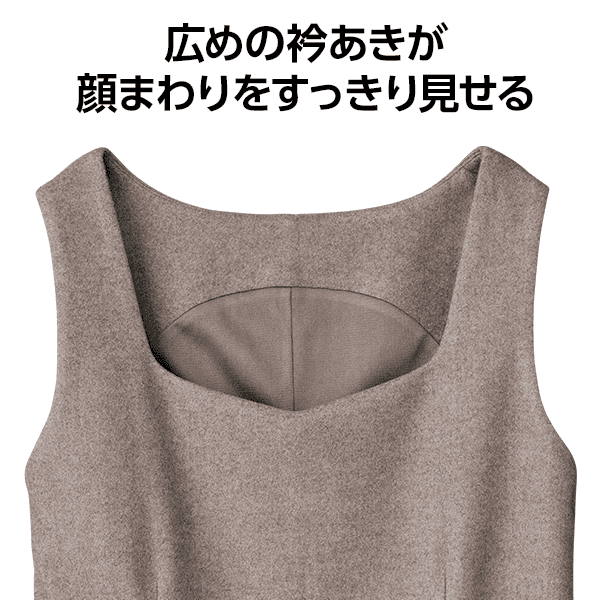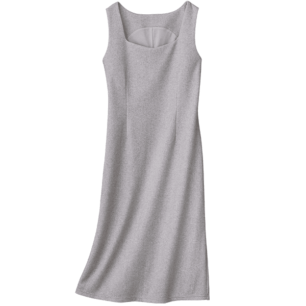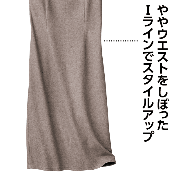 高機能素材でありながらカシミアのような素材感の、ややウエストを絞ったIラインでスタイルアップして見えるワンピース。広めの衿あきが顔まわりをすっきり見せます。表側に断熱性・保温性に優れた中空糸を、肌側には貯めた熱を放出して衣服内を常に適温に保つ繊維を使用したオリジナルの開発素材。機能と肌ざわりのよさを両立します。