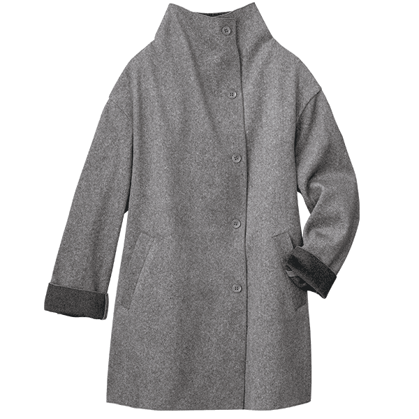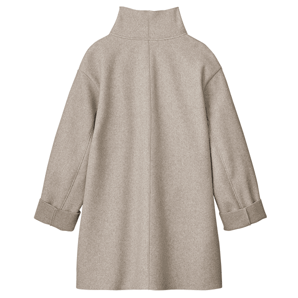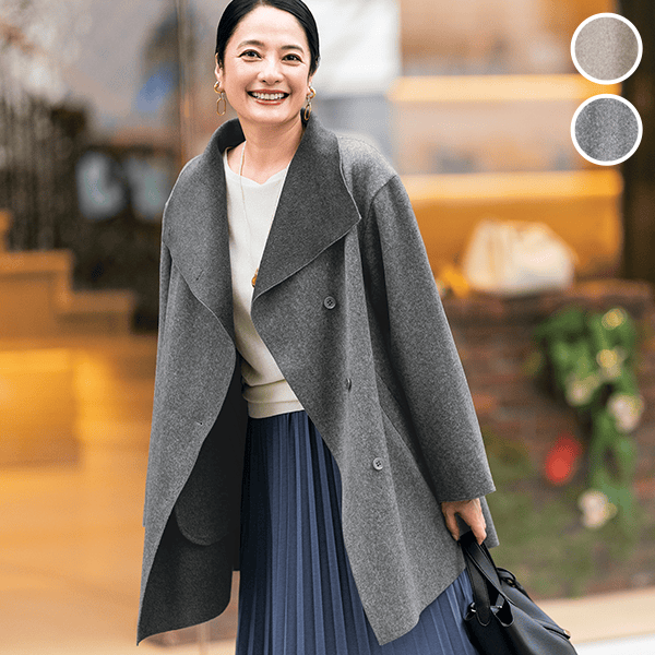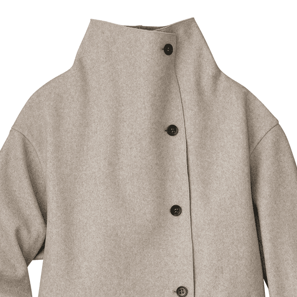 表情豊かに羽織れて、大きな衿が顔まわりをすっきりみせます。ボタンを留めるとドレープ感がエレガントな着こなしに。生地裏は同系の濃色になっているので、ボタンを開けて着た時の衿や、袖口を折り返して配色を楽しめます。イタリア・BARTOLOZZI社プロデュースの生地を採用。ウールのようにやわらかでなめらか。シワになりにくく洗濯機でも洗えるのがうれしいです。