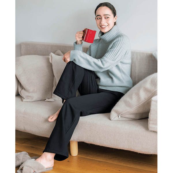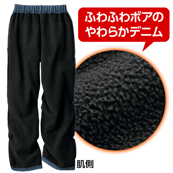 もこもこボアが空気層を作り、しっかり保温されるのがうれしいワイドシルエットのボアパンツ。やわらかなジャージーデニムで軽いはき心地です。DHCでは、とってもふっくらしているのにすっきり見えるようシルエットにこだわっています。