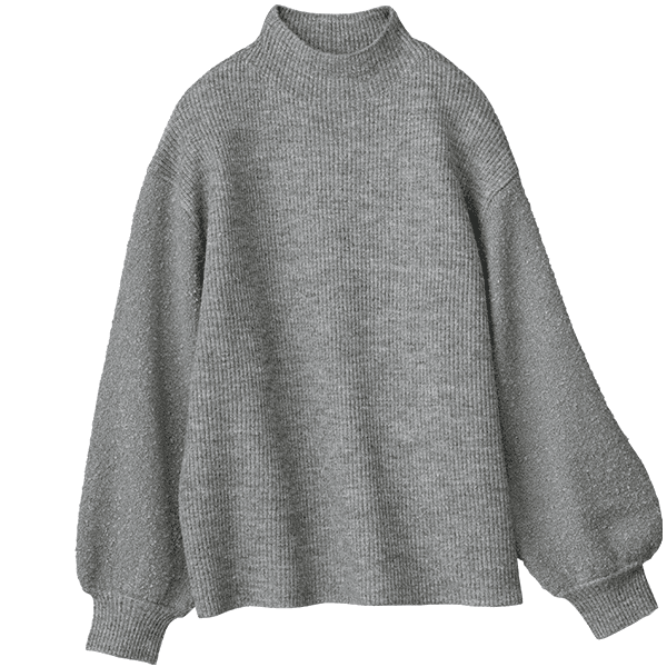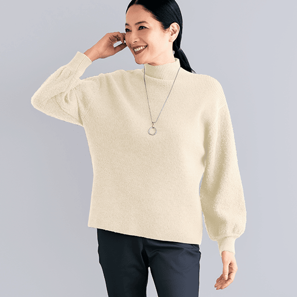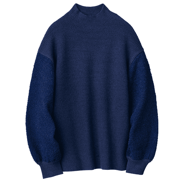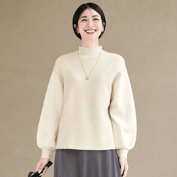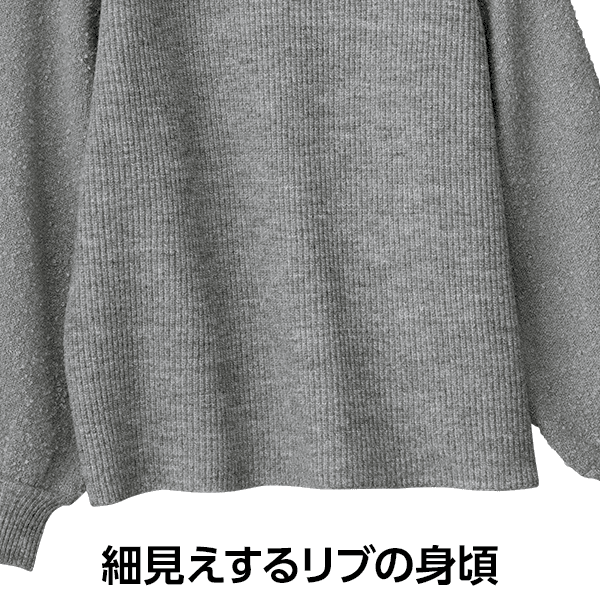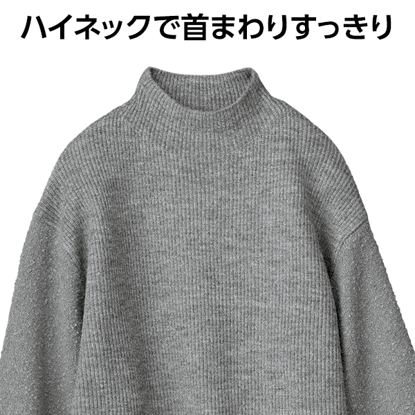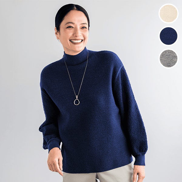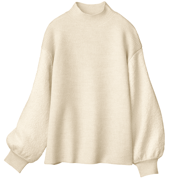 細見えするリブの身頃とボリューム感のあるブークレー糸の袖で着映えするニット。ハイネックが顔まわりをすっきり見せてくれます。