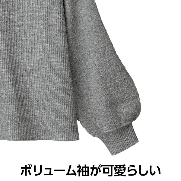 身生地はニット編地で袖部分はポコポコとした生地で温かみがあります。袖丈も許容内です。ウールが1%入っていますが、首回りのチクチクはそれほど感じません。裾にはリブがなく、スッキリしていますので、ウエストインしても出しても楽しめるデザインです。