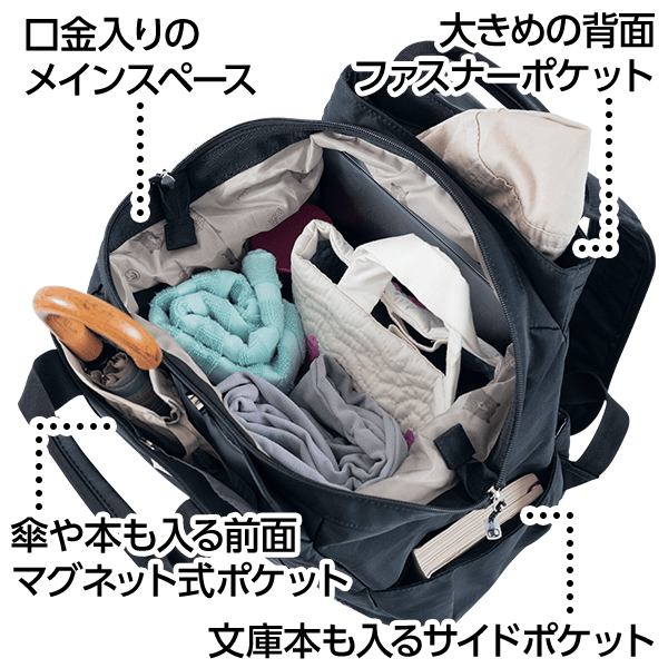 - 仕様/開閉:ダブルファスナー式 肩ショルダー:長さ調節可・取り外し不可 前面:マグネットポケット 中面:オープンポケット×2・ファスナーポケット 背面:ファスナーポケット×2 脇:オープンポケット×2