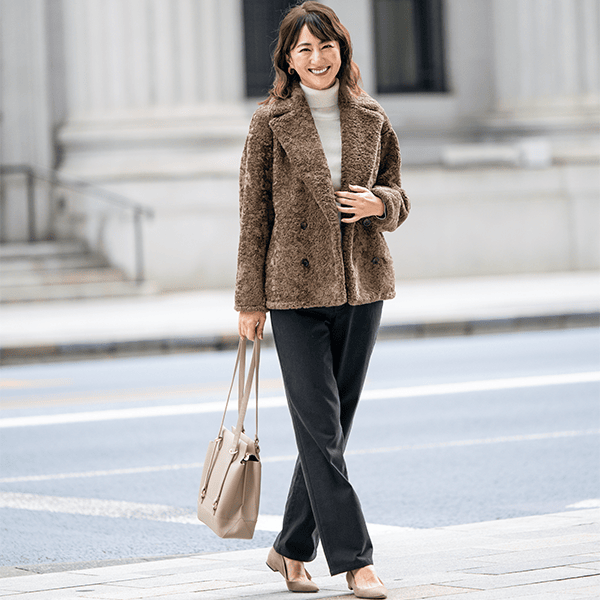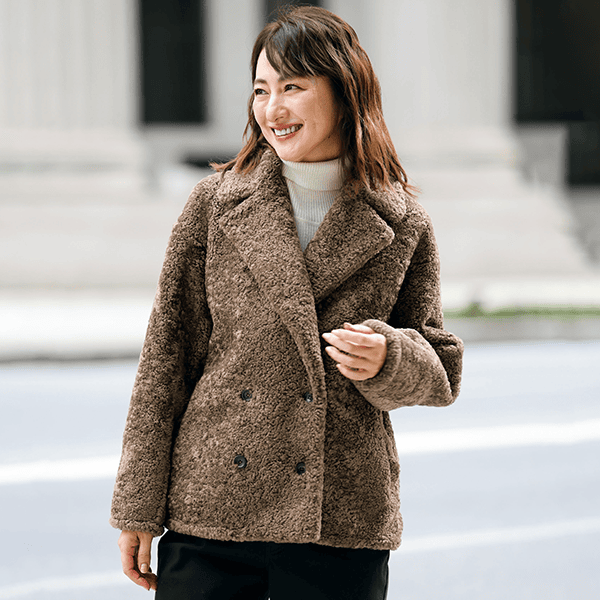 毛足の短いエコファーでデイリーに羽織れて、リッチなボリューム感ながらコンパクトな丈で軽やかなエコシアリングコート。イタリア「BARTOLOZZI」社企画の生地を使用したコートは、コンパクトなミディ丈で着ぶくれず、ボトムスも選びません。生地裏はカットソーをボンディングし、しっかりあたたかです。