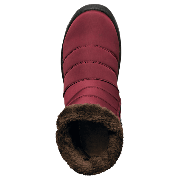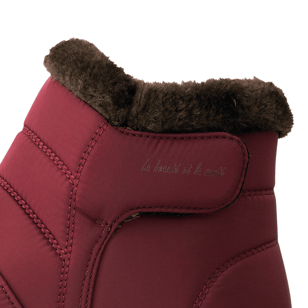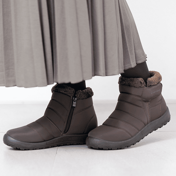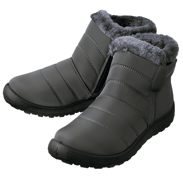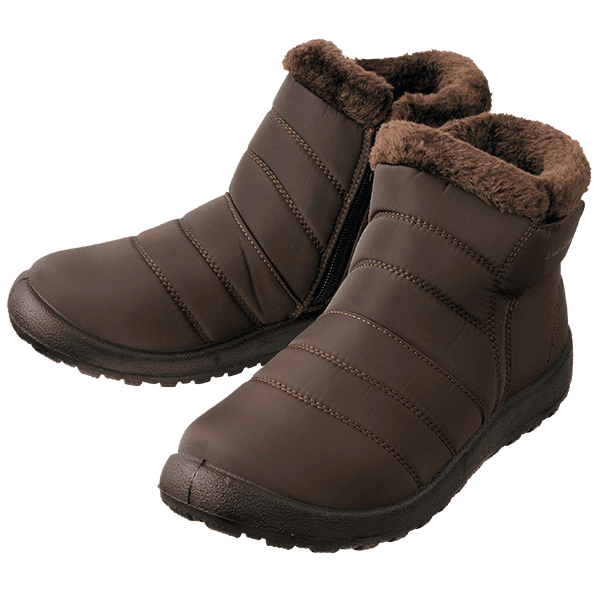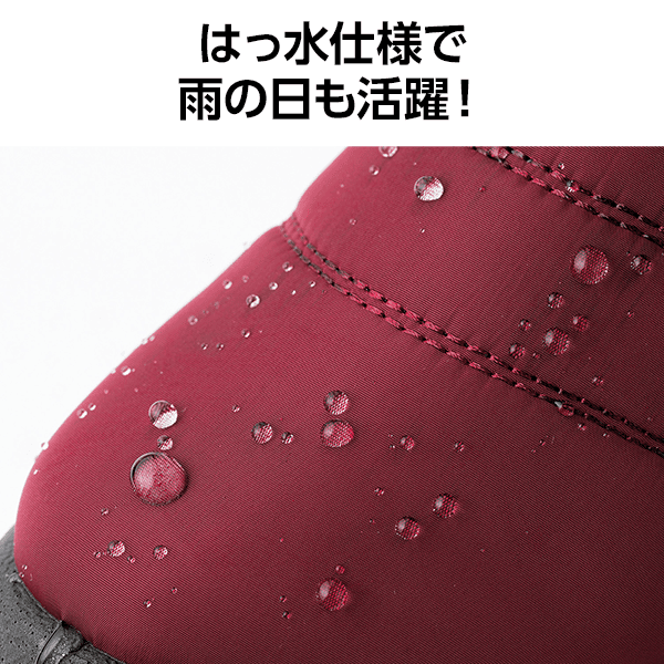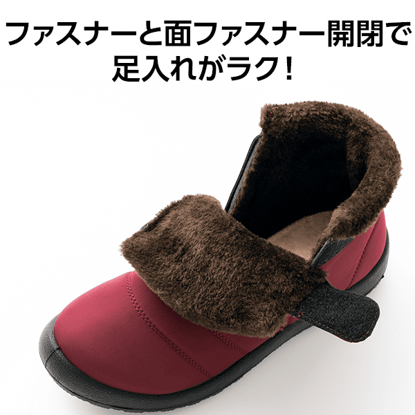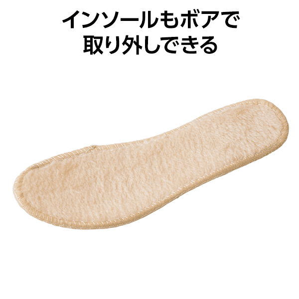 外側はツヤのあるボンディング素材、中側はふかふかのボア仕様で足先まであったかいボンディングブーツ。ファスナーと面ファスナー開閉で足入れラクチン。面ファスナーの留め位置で足首の締め付けの調整も可能です。インソールもあったかボアで取り外しが可能。はっ水仕様で普段履きも雨の日も活躍します。