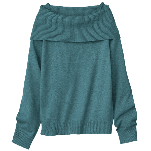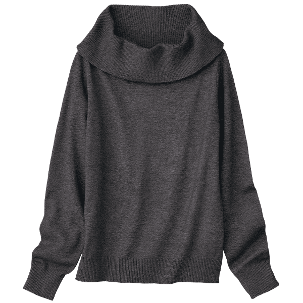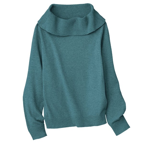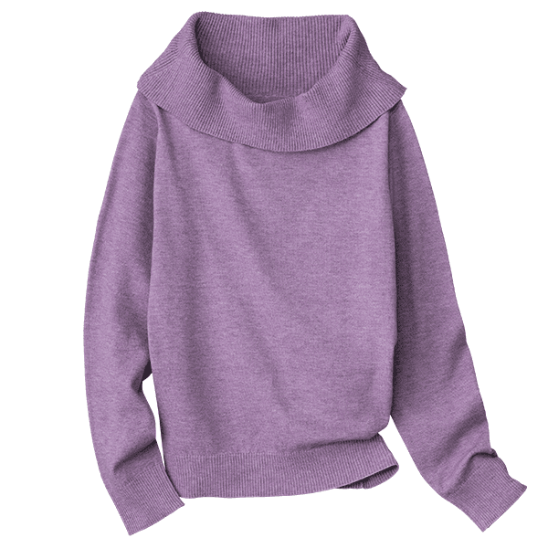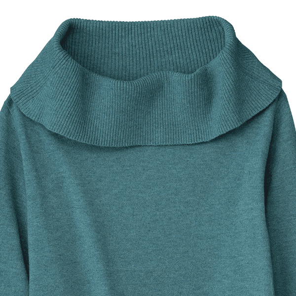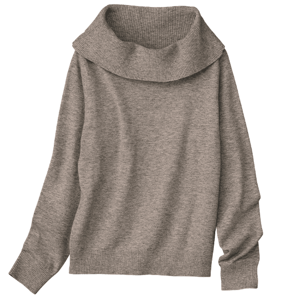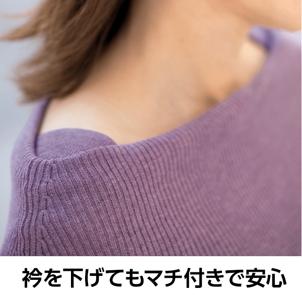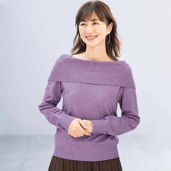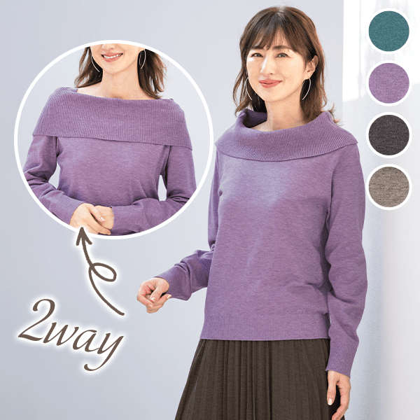 ふわっと立てた衿がやわらかな印象のニットは、衿を肩まで下げてオフショルダー風にも着られるエレガントな2WAYデザイン。なめらかなタッチで着心地がいいのがうれしいです。衿を下げてもマチ付きだから、肩まわりが露出せず安心。