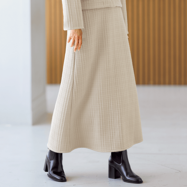 オンオフで着回せる、裏フリースのあったかスカート。表情豊かなチェック柄のジャカードはきれい見えするのにボンディング素材で動きやすく、裏フリースであったか。ほどよくゆとりを入れたナローシルエットで、ボディラインをひろいにくくすっきりとはけるのが魅力です。ジャージー素材だからリラックス感のあるはき心地で、シワも気にならない。単品ではもちろん、セットアップもおすすめです。