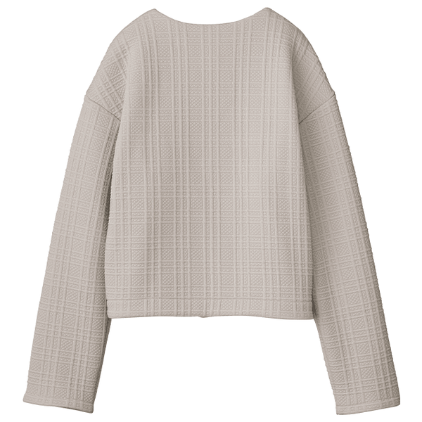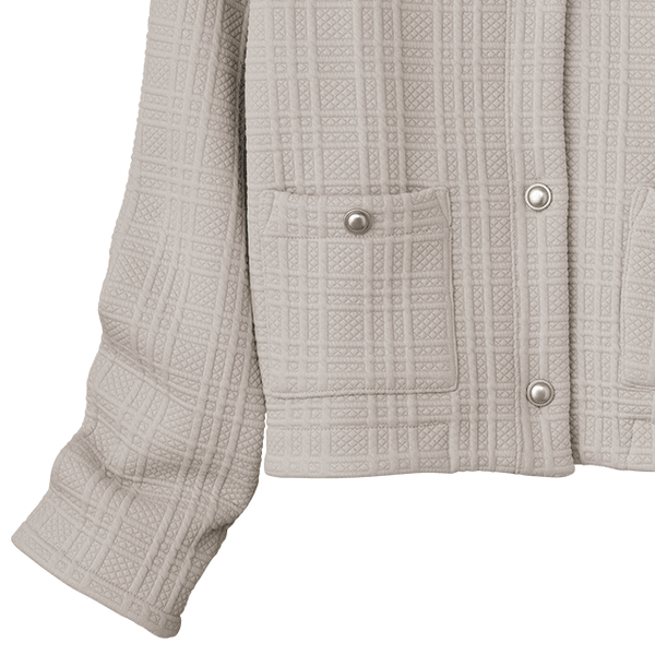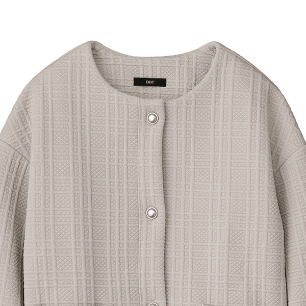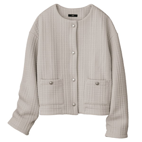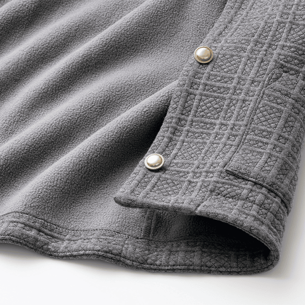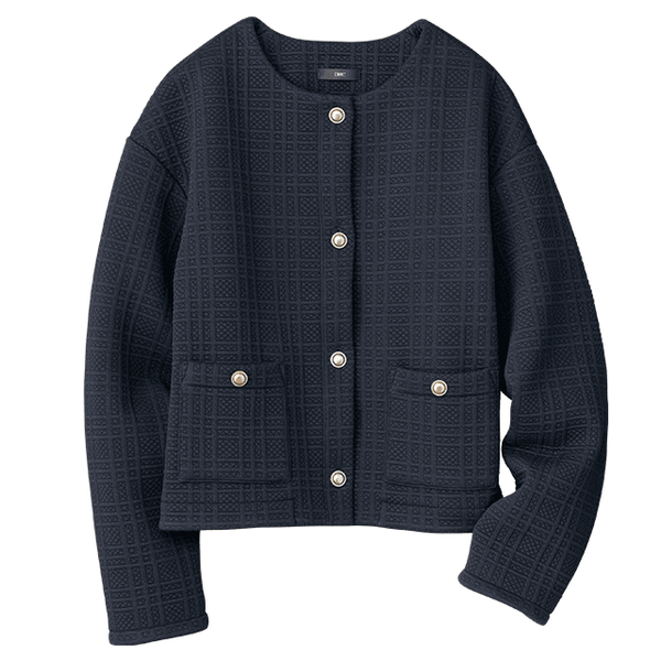 厚みがあり、かつ裏フリースのあたたかさがこの時期にぴったりです。コンパクトに見えますが肩や腕まわりはゆったりしていてリラックス感がありとても着やすいです。ジャカードのチェック柄やボタンが上品なアクセントになっています。