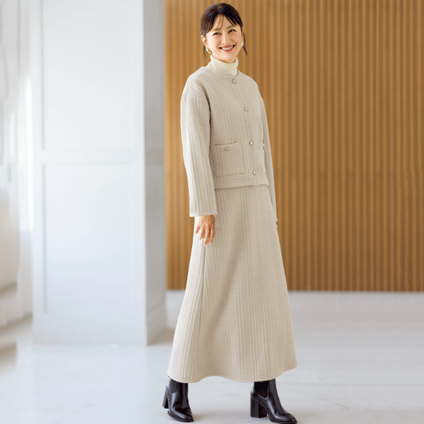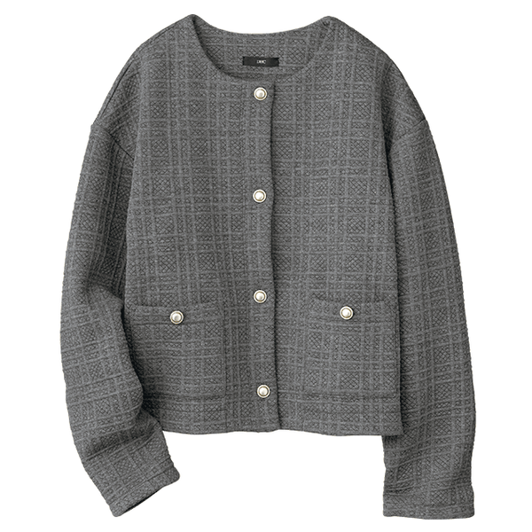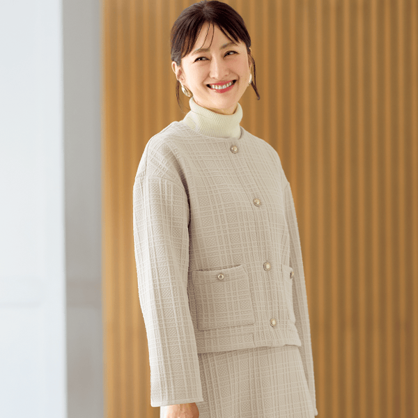 オンオフで着回せる、ジャケットのようなきちんと感のあるあったかカーディガン。表情豊かなチェック柄のジャカードはきれい見えするのにボンディング素材で動きやすく、裏フリースであったか。コンパクトな丈感ですっきりと着こなせて、厚みのある生地感が立体的なシルエットをつくります。単品ではもちろん、セットアップで着用するとオケージョンシーンでも使えます。