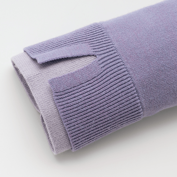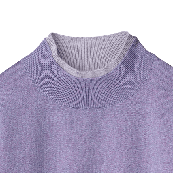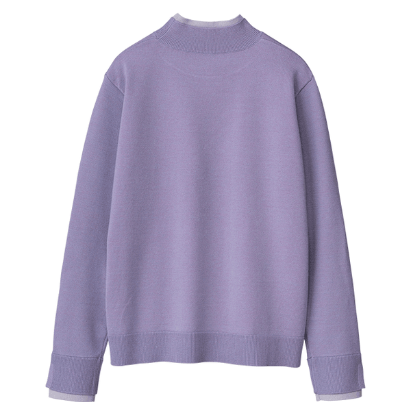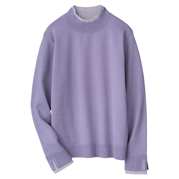 ハイゲージの上品で繊細な編地のニットです。もたつき感もなくコンパクトにすっきり着られました。衿のハイネックは首に沿うようなデザインです。さりげない配色を楽しめるレイヤードデザインです。