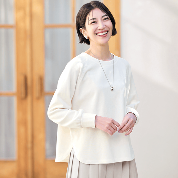 裏起毛であたたかく、ほどよく厚みのあるカットソーは、ドルマン風のゆったりシルエットでシンプルながらサマになります。