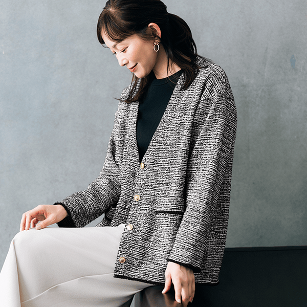 さっと羽織るだけでサマになって、オンオフで着回せるきれいめカットツイードカーディガン。