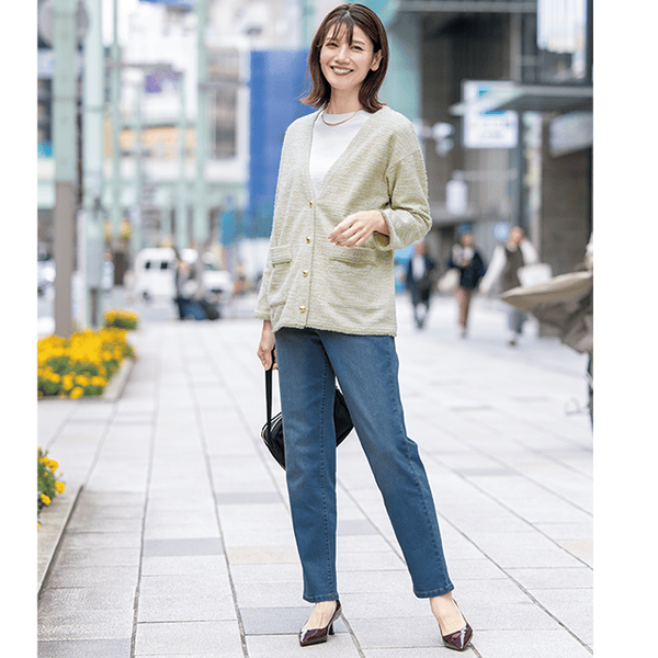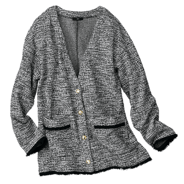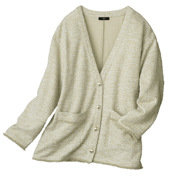 さっと羽織るだけでサマになって、オンオフで着回せるきれいめカットツイードカーディガン。